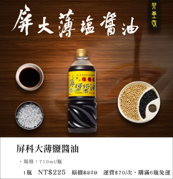 屏科大薄鹽醬油採用傳統的日本濃口醬油之釀造方式,使用經檢驗合格的非基因改造黃豆、小麥為原料,並以紅麴酵素代替焦糖色素,低鈉純釀、口感甘醇,不添加鉀鹽、不含防腐劑、無化學色素及人工甘味香料,低鈉低鉀的優秀健康醬油!